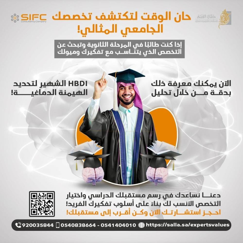 وصف الخدمة: تقدم خدمة تحديد التخصص الجامعي للطلاب الذين يبحثون عن تخصص مناسب يلائم اهتماماتهم وأسلوب تفكيرهم. باستخدام أداة التحليل الدماغي HBDI (Herrmann Brain Dominance Instrument)، يتم تحديد نمط التفكير المفضل للطالب بناءً على الهيمنة الدماغية، مما يساعد في توجيهه نحو التخصص الأكاديمي الذي يتماشى مع ميوله وقدراته الفكرية.